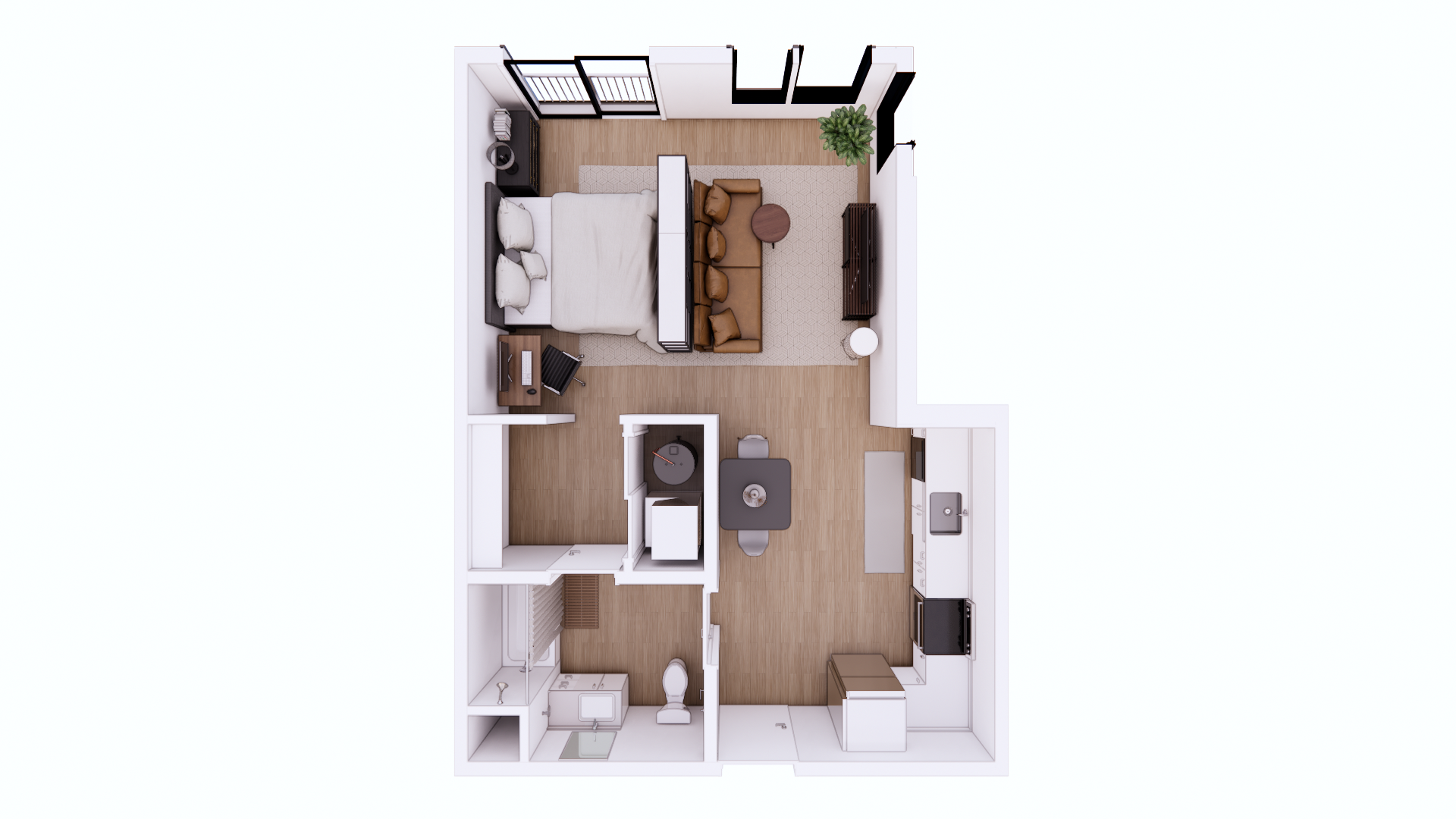 This light‑filled studio maximizes natural light and storage. A thoughtfully placed full kitchen featuring quartz countertops, stainless‑steel appliances and coordinated black fixtures makes cooking enjoyable. The bath echoes the same modern finishes. Durable luxury vinyl wood flooring and in‑unit washer/dryer connections provide everyday practicality. When it’s time to relax, residents can grab coffee at a nearby café or meet friends in UA Station’s manicured courtyard and walking trails. This plan suits those who appreciate stylish efficiency in a vibrant, walkable neighborhood.